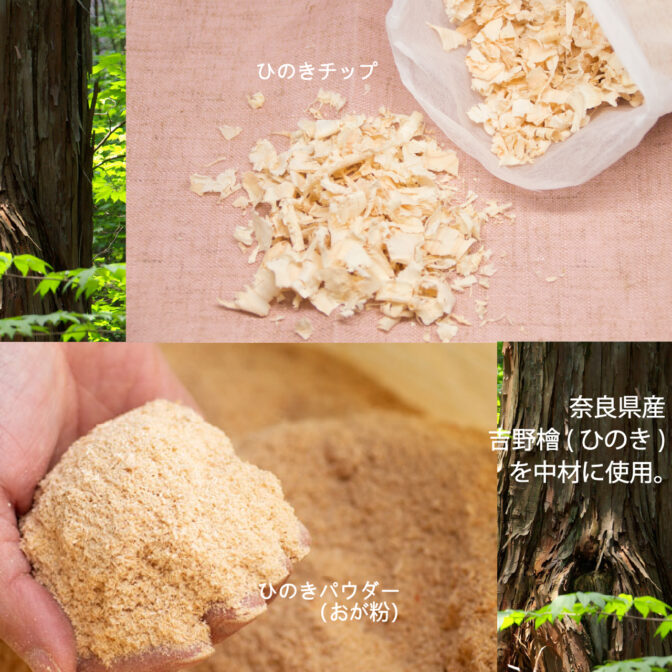 天然吉野檜から加工した、ひのきパウダーとひのきチップを使用した